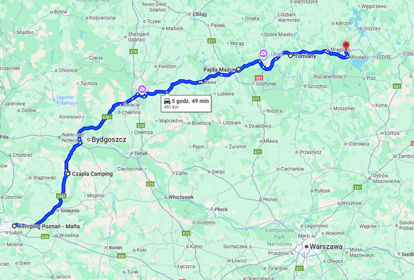 A beautiful, charming route that leads from Poznań, through Żnin, Biskupin, Ostróda, Gietrzwałd, Olsztyn, Giżycko to Mikołajki in Masuria.